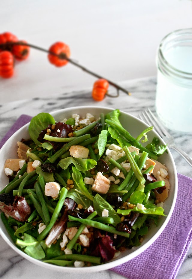 I have a pretty good plan for this Thanksgiving. Enjoy all the food without guilt and then instead of turkey sandwiches with the leftovers, I will be preparing salads with my turkey, in an attempt to try and be a little healthier. This salad is really awesome because it already has most of the ingredients I work with for Thanksgiving dinner, just in a healthier and more simple version.